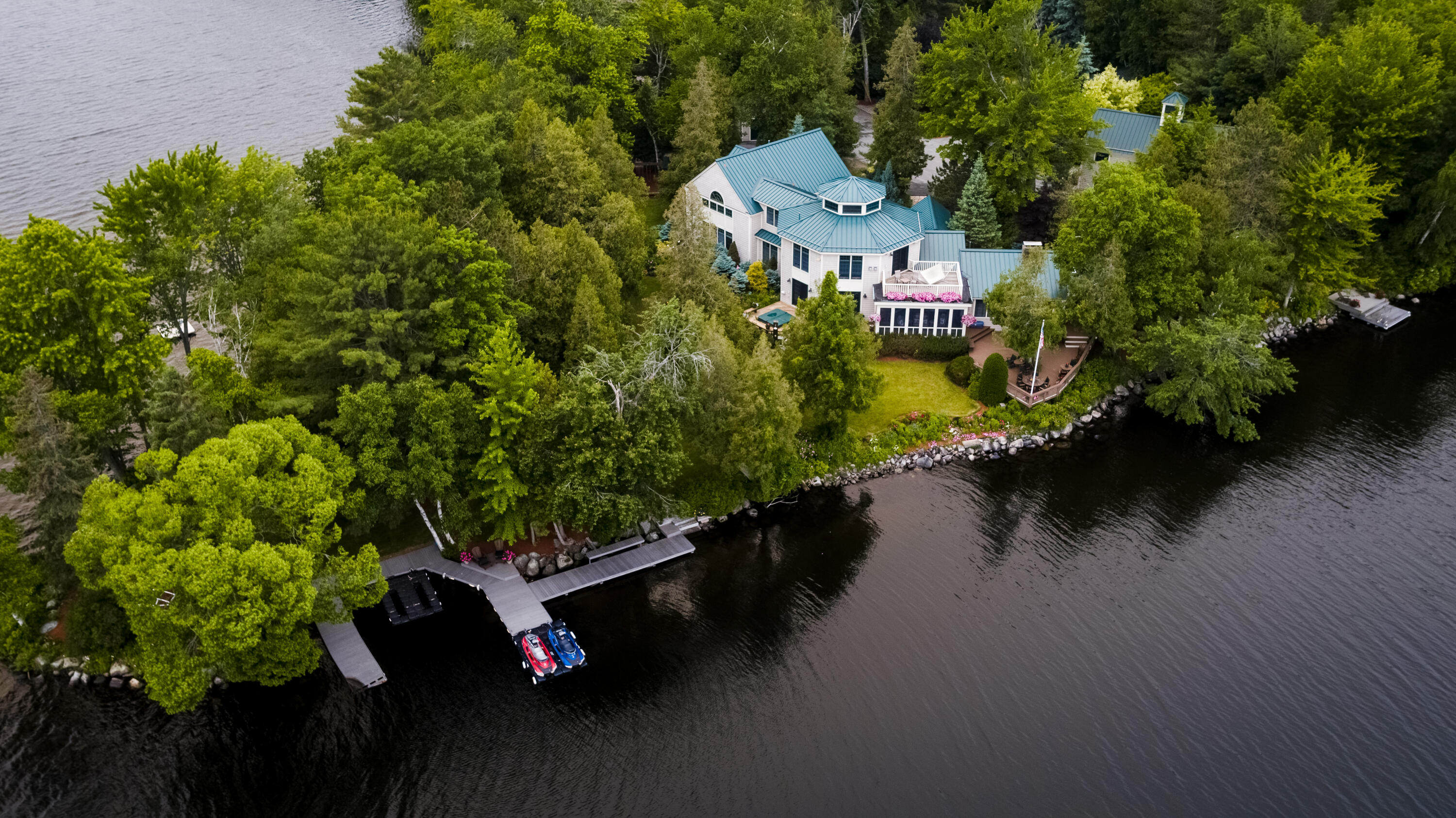 There are multiple docks to enjoy the 1,050ft of waterfrontage that surrounds the property