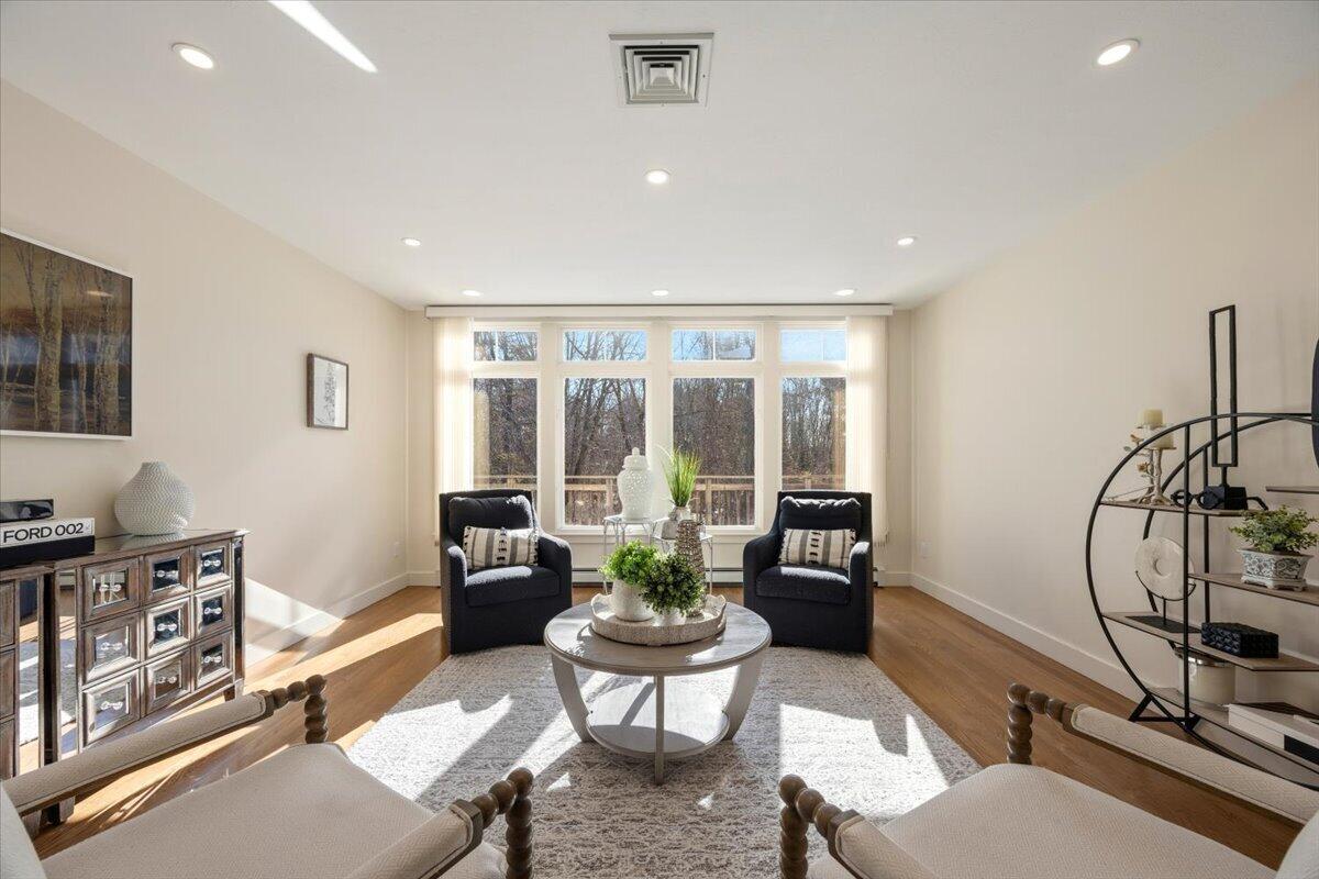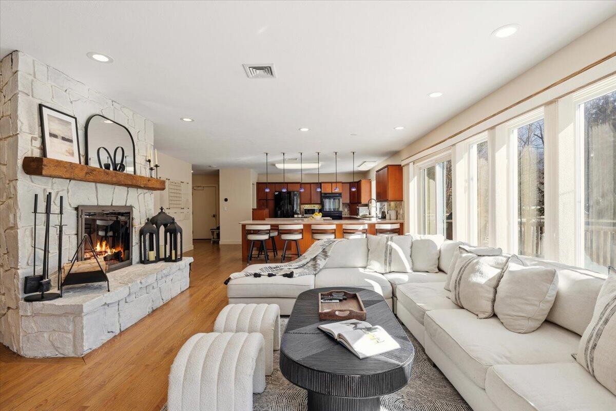 A striking entryway, defined by cathedral ceilings and abundant natural light, creates an immediate impression. From there, the home unfolds into beautifully connected living spaces, where a modern, well-appointed kitchen anchors both everyday living and elevated entertaining. The adjoining dining area and living room provide an elegant backdrop for gatherings, while also offering moments of calm overlooking the surrounding landscape.